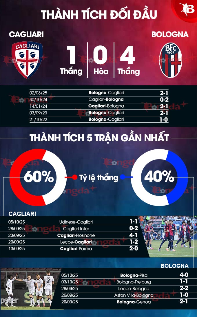 Trong khi Cagliari thắng 3/5 trận gần nhất thì Bologna chỉ thắng 2/5 trận vừa xong. Trên sân nhà, Cagliari thắng 3/5 trận vừa xong còn Bologna lại chưa có niềm vui tại sân khách kể từ khi mùa giải mới khởi tranh.