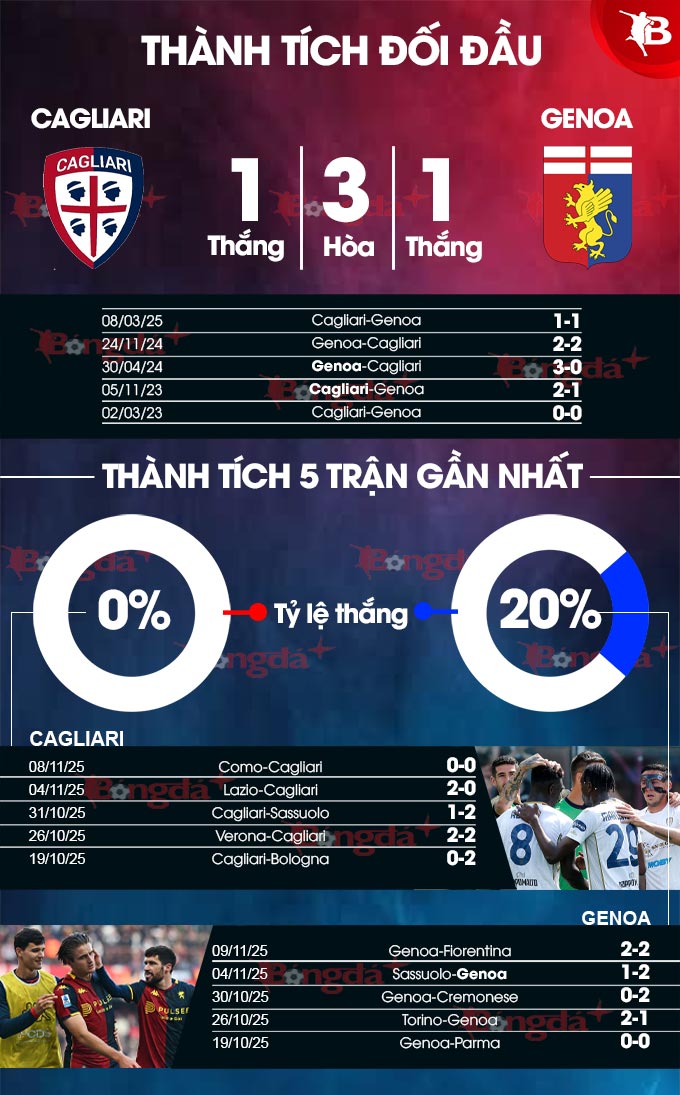 Phong độ sân nhà của Cagliari đặc biệt bấp bênh khi thua cả 3 trận gần nhất tại Unipol Domus với tổng tỷ số 6-1. Tuy nhiên, người hâm mộ vẫn có thể tin tưởng vào một điểm tích cực nhỏ vì họ chưa thua trận nào trong ba trận sân nhà gần nhất gặp Genoa - đối thủ ngày hôm nay.