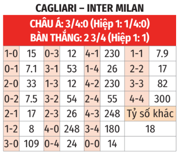 - Từ 2 đến 3 bàn: 3/4 trận chính thức gần đây trên sân khách của Inter có 2 tới 3 bàn thắng. 9/11 trận chính thức vừa qua của Cagliari và 4/6 lần đối đầu gần nhất giữa đôi bên tại đảo Sardegna cũng khép lại với 2 hoặc 3 lần lưới rung.