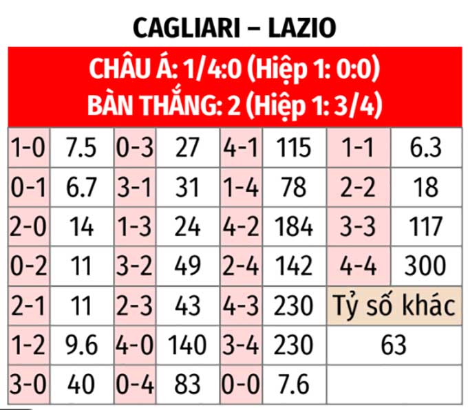 - Cagliari thắng hiệp 1 theo châu Á: Cagliari thắng hiệp 1 theo châu Á ở 3/4 trận sân nhà gần nhất. Tiếp đón Lazio thua hiệp 1 theo châu Á ở 5/6 trận gần đây, đội chủ nhà là sự lựa chọn đáng tin trước giờ nghỉ.