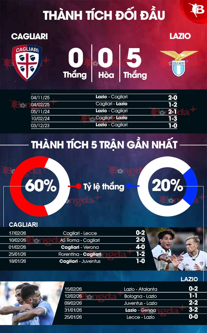 - Tỷ số chẵn: 3 trận gần đây của Cagliari đều kết thúc với tỷ số chẵn. Đây cũng là điều xảy ra ở 3 trận vừa qua của Lazio.