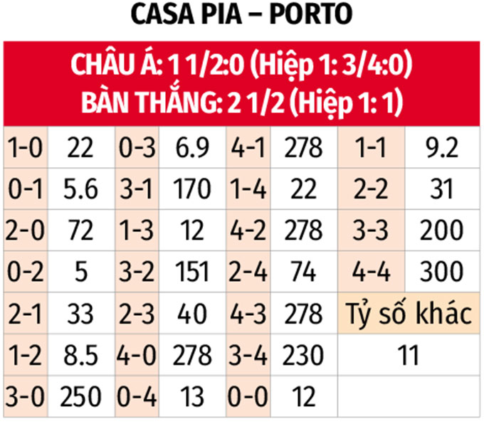 - Hiệp 1 có từ 4 góc trở lên: Lịch sử đối đầu chứng kiến 5/7 trận gặp nhau gần nhất giữa hai đội đều kết thúc với ít nhất 5 tình huống đá phạt góc. Kịch bản bản này hoàn toàn có thể tái diễn, khi hai đội gần đây đều đang tích cực "cày góc". 7/9 trận gần đây của Casa Pia cùng 5/6 trận vừa qua của Porto đều có tối thiểu 4 lần bóng được đặt ở bốn cột góc cuối sân trước giờ nghỉ.