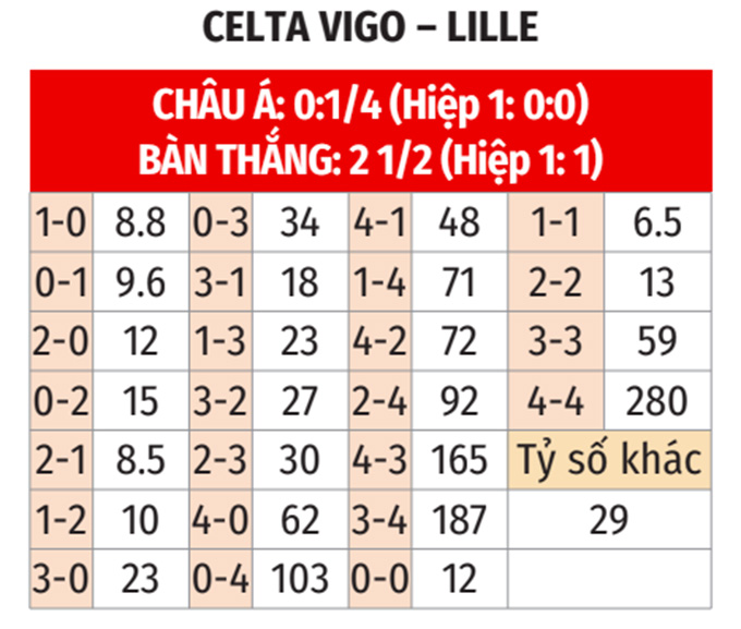 - Tổng bàn thắng là lẻ: Cả 3 trận gần nhất của Celta Vigo và 7/8 trận vừa qua của Lille đều khép lại với tổng bàn thắng là lẻ. Không những thế, 5/7 trận sân nhà gần nhất của Celta Vigo và 5/6 chuyến làm khách vừa qua cũng kết thúc với tổng bàn thắng không chia hết cho 2.