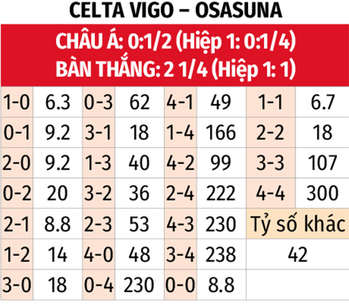 • Nhiều bàn thắng: 4/5 trận đấu gần đây của Celta Vigo cùng 4 trận liên tiếp vừa qua của Osasuna đều kết thúc với ít nhất 4 bàn thắng được ghi. Lịch sử đối đầu cũng chứng kiến 3/4 trận gặp nhau gần nhất giữa đôi bên có tối thiểu 3 pha làm bàn.
