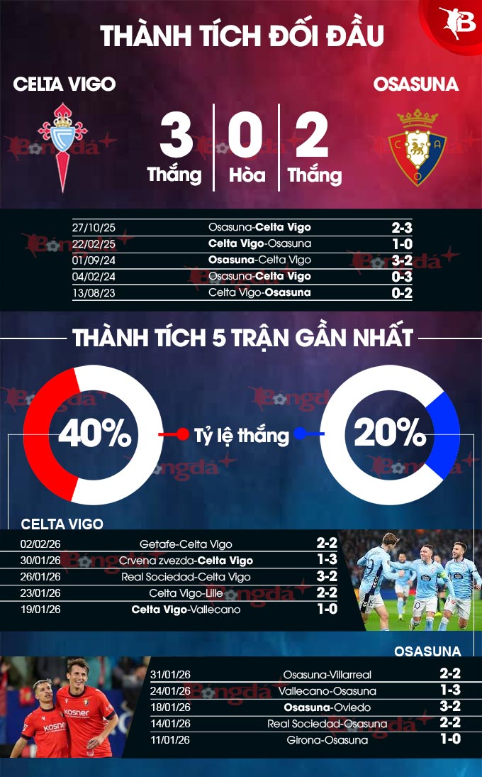 Có đôi chút e ngại dành cho NHM Celta Vigo là đối thủ Osasuna bước vào chuyến làm khách đêm nay với phong độ khá tốt, giành được 7 điểm từ 3 trận gần nhất, đánh bại Oviedo và Vallecano trước khi hòa 2-2 với Villarreal đang có phong độ cao ở trận đấu trước đó. Osasuna hiện có 26 điểm sau 22 trận đấu với thành tích 7 chiến thắng, 5 trận hòa và 10 trận thua, giúp họ đứng thứ 9 trên BXH.