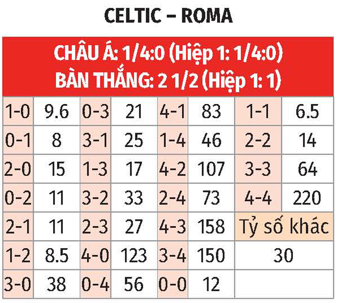 - Lẻ bàn thắng: 4/5 trận vừa xong của Celtic có tổng bàn thắng không chia hết cho 2. Ngoài ra, 7/10 trận vừa qua của Roma chứng kiến điều tương tự. Nhiều khả năng, trận đấu tới sẽ có kết quả tương tự.