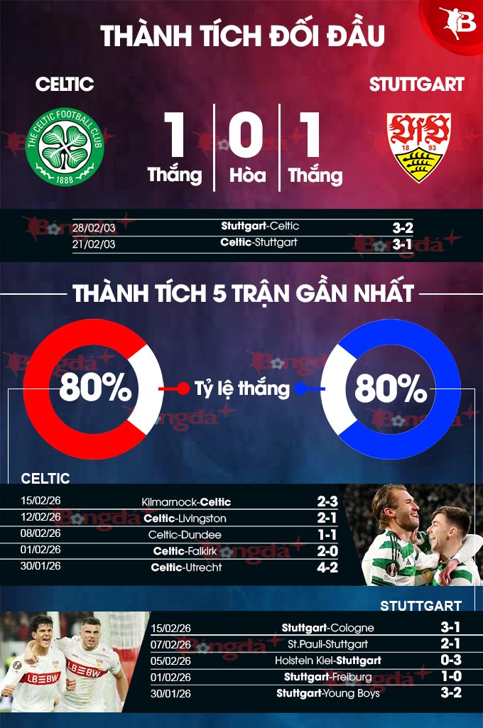 Trong khi đó, phong độ của Celtic tại các giải đấu Cúp không thực sự thuyết phục. Thống kê chỉ ra rằng, trong 6 trận đấu trở lại đây, đội bóng của Scotland chỉ giành được vỏn vẹn 2 chiến thắng. Với thành tích thi đấu như vậy, rất khó để họ có thể làm nên bất ngờ trước đội bóng đang “vào phom” như Stuttgart, bất chấp việc có lợi thế được thi đấu trên sân nhà ở trận này.