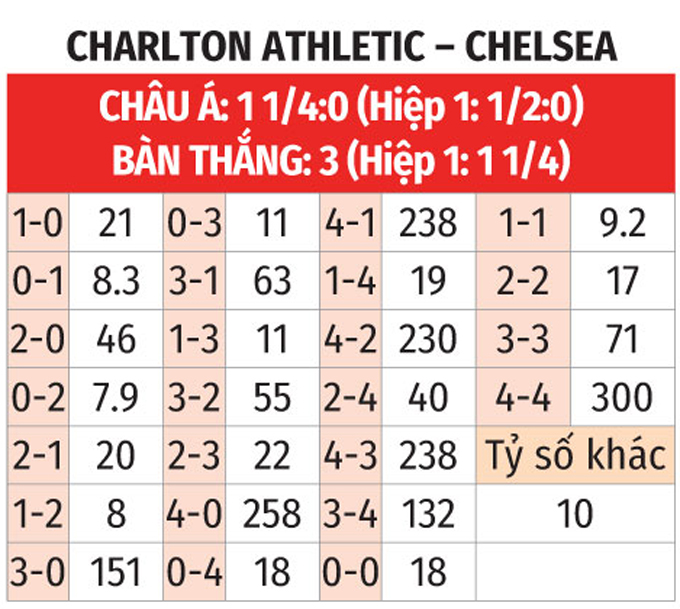 - Lưới rung 15 phút cuối: 5/8 trận gần nhất của Charlton có bàn thắng từ phút 75 trở đi. 4/6 trận mới đây của Chelsea cũng chung kịch bản.