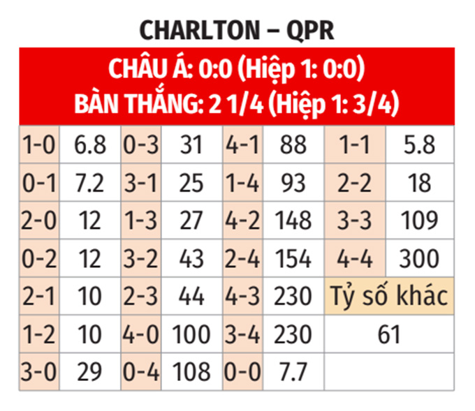 - Hiệp 1 tối đa 1 bàn: 9/10 cuộc đối đầu gần nhất giữa hai đội đều khép lại với không quá 1 bàn trong hiệp 1. Ngoài ra, 9/11 trận gần đây của Charlton và 8/9 trận vừa qua của QPR đều có nhiều nhất 1 bàn trong hiệp đấu đầu tiên. Kịch bản tương tự trong hiệp 1 cũng xảy ra ở cả 5 trận sân nhà gần đây của Charlton và 4/5 chuyến làm khách vừa qua của QPR.