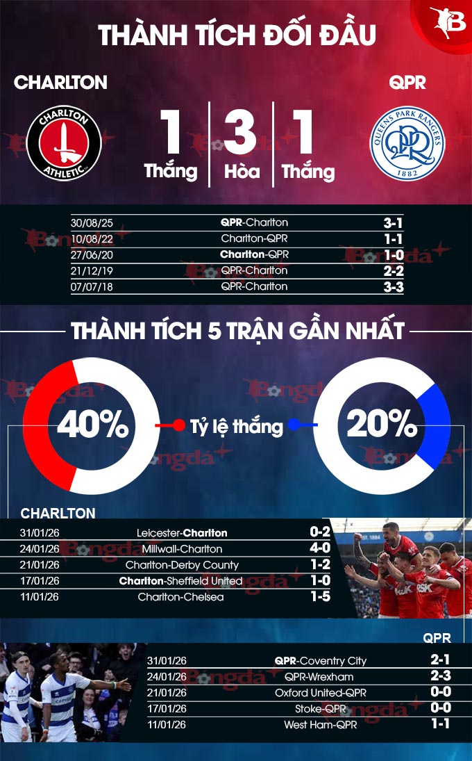 Khi hạng Nhất Anh 2025/26 bước vào giai đoạn then chốt, Charlton sẽ tiếp đón QPR tại sân The Valley. Cả 2 đội đều đã trải qua những thăng trầm trong mùa giải này, tạo nên một trận đấu hứa hẹn sự cân bằng và nhiều pha bóng chiến thuật hấp dẫn. Ngoài ra, những lần đối đầu gần đây giữa 2 đội càng cho thấy sự cân bằng đáng kinh ngạc giữa họ. Trong 6 lần chạm trán gần nhất giữa Charlton và QPR, mỗi đội giành được 2 chiến thắng và 2 trận hòa, phản ánh một cuộc cạnh tranh sòng phẳng.
