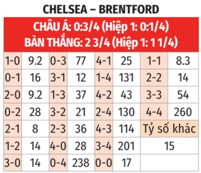 - Tối thiểu 5 góc hiệp 1: 3/4 trận đấu gần đây của Chelsea đều xuất hiện từ 5 quả phạt góc trở lên trong hiệp 1. Tình trạng tương tự xảy ra ở 5/7 trận sân khách vưa qua của Brentford.