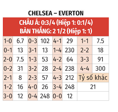 - Cả 2 đội ghi bàn: 3/4 trận gần nhất của Chelsea có hiện tượng cả 2 đội ghi được bàn thắng. 4/6 trận gần nhất của The Blues trên sân nhà cũng có kịch bản tương tự xảy ra. Hàng công của Everton đang vào phom. Còn khả năng phòng ngự của Chelsea chưa bao giờ được đánh giá cao. Trận này sẽ có 2 đội ghi được bàn thắng.