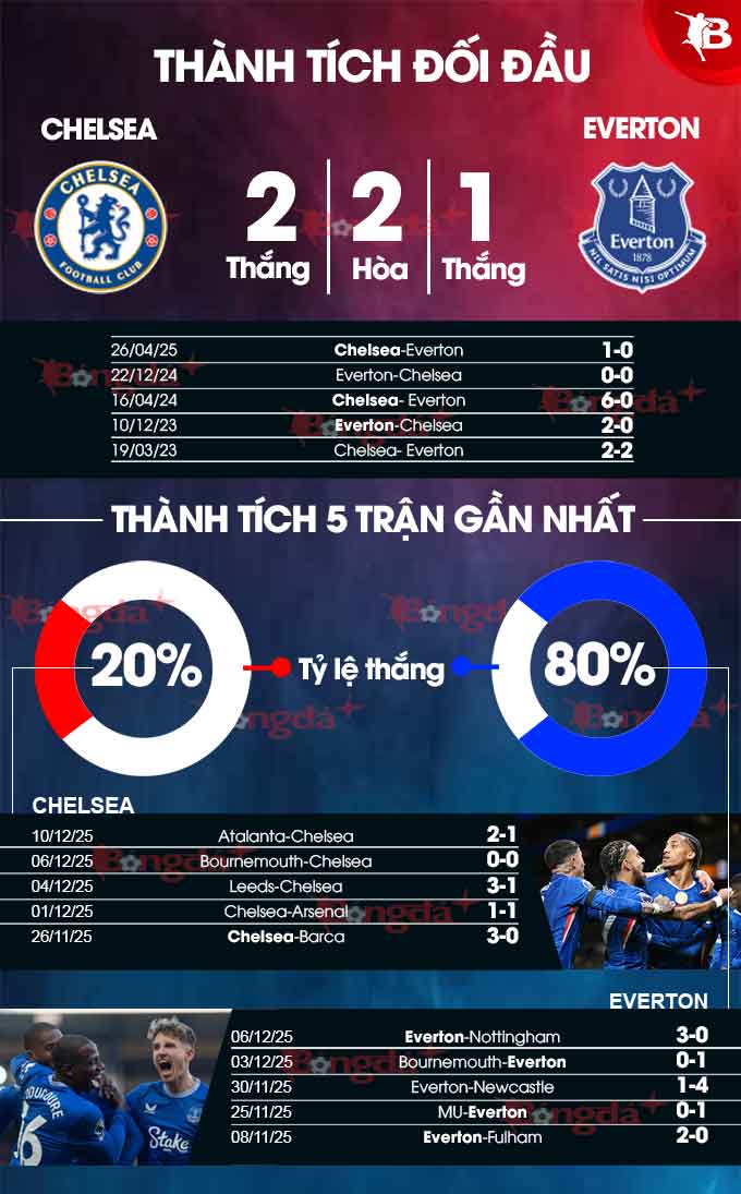 Trong 15 lần đụng độ gần nhất ở Premier League thì Everton cũng cho thấy họ luôn tạo ra nhiều khó khăn cho Chelsea khi thắng 5, hoà 5 và chỉ thua 5 trận. Everton đủ sức lấy 1 điểm tại Stamford Bridge.