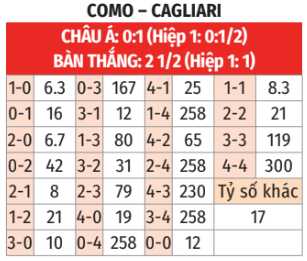 - Từ 2 tới 3 bàn: 7/8 trận Serie A gần đây của Cagliari chấm dứt với tổng bàn thắng rơi vào đoạn từ 2 tới 3. Tương tự, 5/6 trận chính thức vừa qua trên sân nhà của Como và 5/6 lần chạm trán gần nhất giữa đôi bên cũng có 2 đến 3 lần lưới rung.