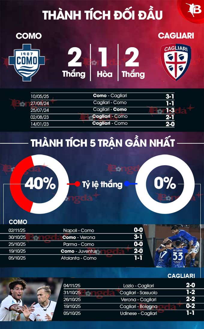 Cagliari không hề yếu nhưng thất bại 0-2 trên sân của Lazio hồi đầu tuần này kéo dài thêm một giai đoạn sa sút về thành tích khó tránh khỏi của một CLB ở nửa sau BXH. Trong 6 trận gần nhất, thành tích của Cagliari là thua 4, hòa 2. 6 trận đó Cagliari nhận cả thảy 11 bàn thua tức trung bình gần 2 bàn/trận. Với phong độ như vậy Cagliari khó có thể gây bất ngờ trong chuyến đi tới miền Bắc. Còn Como có cơ hội lớn để bắt đầu hành trình tiến vào tốp đầu.