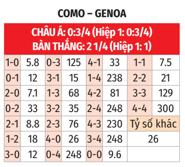 - X cả trận: 2 trận gần đây của cả Como lẫn Genoa đều về X. 3/4 trận gần nhất giữa 2 đội bóng này cũng diễn ra theo kịch bản tương tự nên khả năng cao là trận tới sẽ không có nhiều bàn thắng.