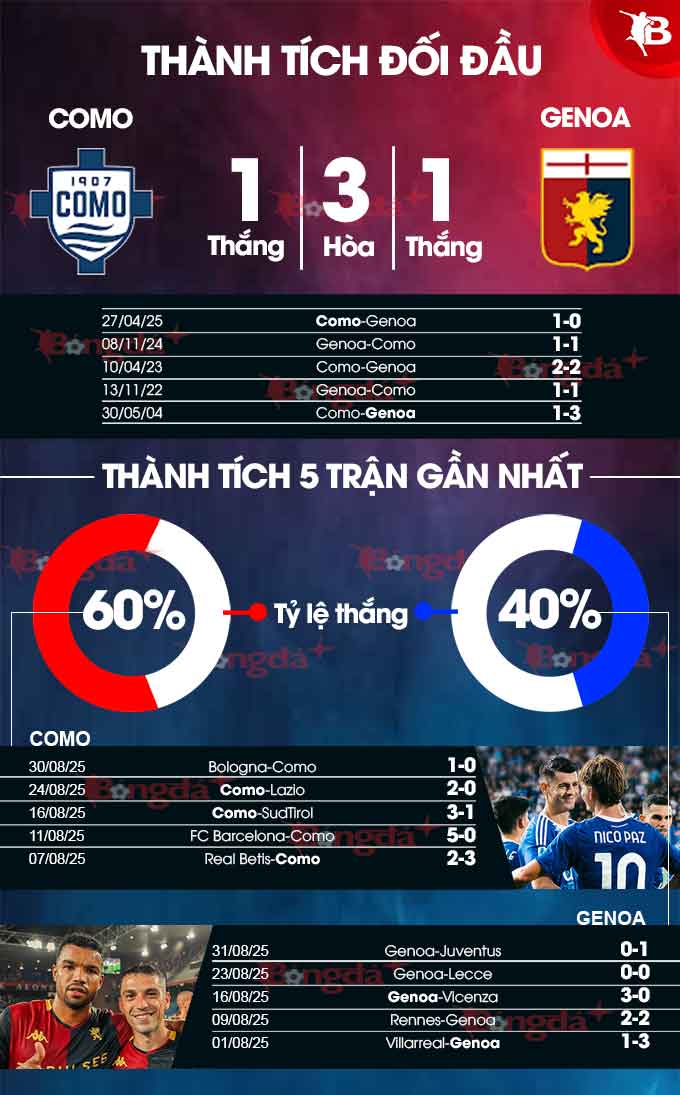 Xét về thành tích đối đầu, Genoa cũng có lý do để e ngại Como vì họ không được lịch sử ủng hộ. Bằng chứng là Genoa đã trải qua chuỗi 4 trận liên tiếp chỉ biết hòa và thua trước Como. Với việc mới ở mùa giải trước Genoa từng thất thủ 0-1 khi tới làm khách trên sân của Como, sẽ chẳng ai bất ngờ nếu kịch bản trên được lặp lại.