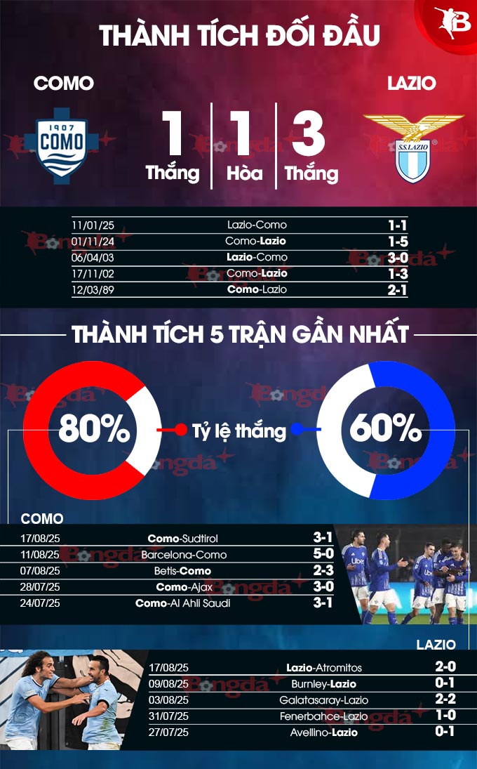 Como và Lazio từng 28 lần chạm trán nhau trong quá khứ. Como chỉ thắng 5, Lazio thắng 13 và hai đội hòa nhau 10 lần.