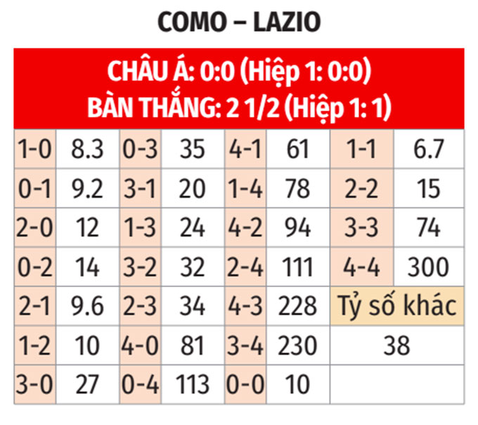 - Como thắng theo châu á: Como thắng 5/6 trận gần nhất, thắng 7/8 trận sân nhà vừa qua. Trong khi đó, Lazio thua 5/8 trận gần đây. Do vậy, những người yêu mến Como có thể đặt niềm tin vào đội chủ nhà ở cuộc đối đầu với Lazio lần này.