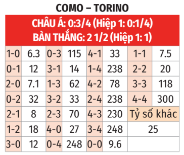 - Không quá 2 bàn: 7/8 trận sân nhà gần đây ở Serie A khi Como là đội chiếu trên chỉ có tối đa 2 bàn thắng. Tương tự, 4/6 trận sân khách vừa qua của Torino tại Serie A cũng không thể chạm mốc 3 lần lưới rung. Trừ trận lượt đi Como bất ngờ thắng 5-1, cả 6 lần chạm trán liên tiếp trước đó giữa đôi bên đều không có quá 2 bàn.