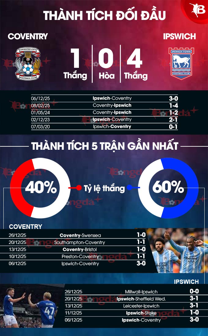 - Hai đội cùng ghi bàn: 7/9 cuộc chạm trán gần nhất, cả 14 lần đụng độ gần đây tại Coventry đều khép lại với ít nhất 1 bàn thắng cho mỗi đội. Không những thế, 5/8 trận gần đây của Coventry và 7/9 chuyến làm khách vừa qua của Ipswich cũng khép lại mà không đội nào giữ sạch lưới nhà.