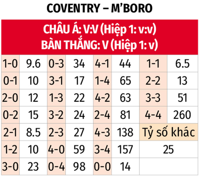 - Lẻ bàn thắng: 6/7 trận gần đây của Coventry cùng 4/5 trận vừa qua của Middlesbrough đều có tổng bàn thắng là lẻ. Kịch bản lẻ bàn thắng cũng diễn ra ở 4/7 trận đối đầu gần nhất.
