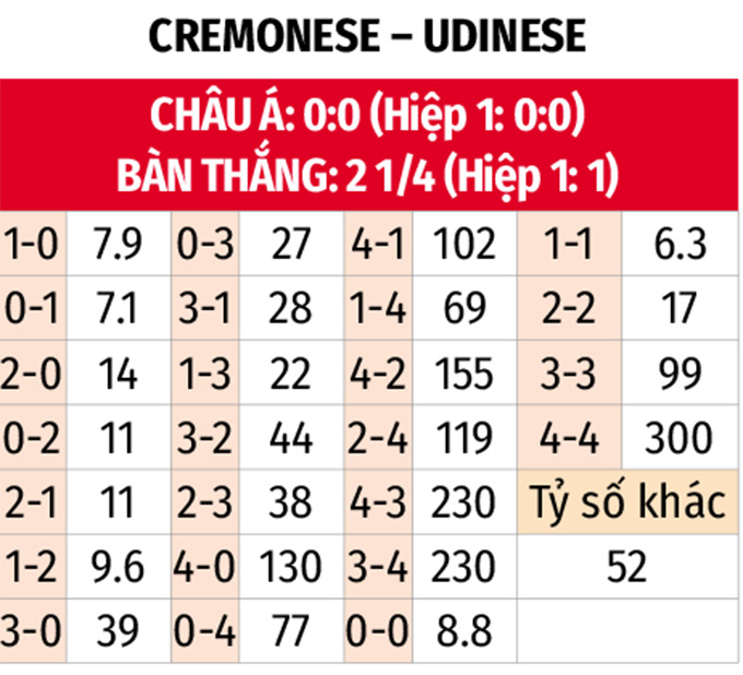- Tối đa 1 bàn hiệp 1: 4/8 trận gần đây của Cremonese đều khép lại hiệp đầu tiên với tỷ số hòa 0-0. Với Udinese, 3 trận vừa qua của đội bóng này tại đấu trường Serie A các chân sút của họ không ghi được bàn thắng vào lưới đối phương.