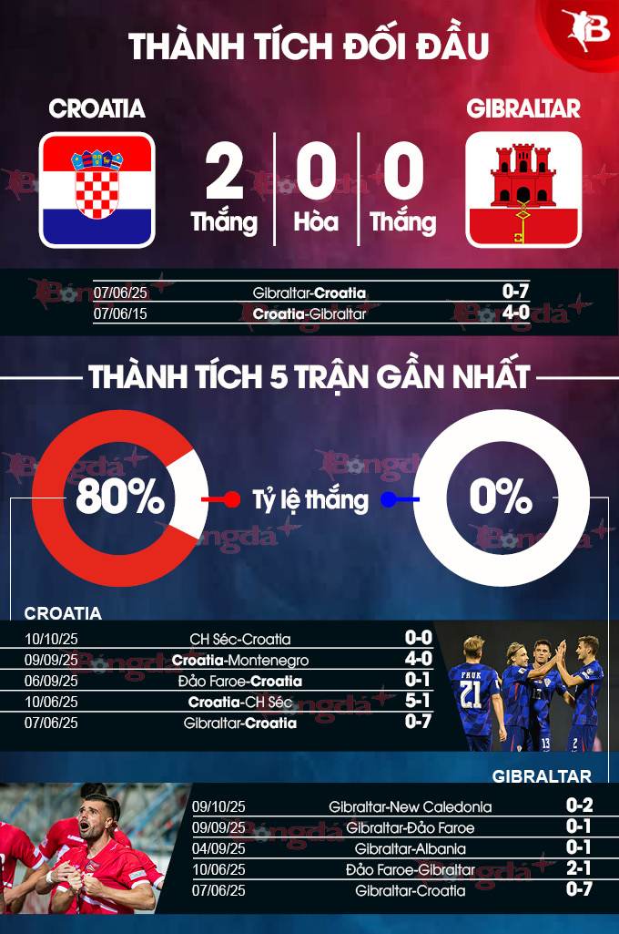 - Croatia giữ sạch lưới nhà: Croatia thắng và không để thủng lưới bàn nào ở 2 cuộc đối đầu giữa hai đội, không để thủng lưới ở cả 3 trận gần đây. Ngoài ra, họ cũng giữ sạch lưới ở 5/8 trận sân nhà vừa qua. Còn Gibraltar không có khả năng ghi bàn ở 5/6 trận gần nhất, ở 7/10 chuyến làm khách gần đây,