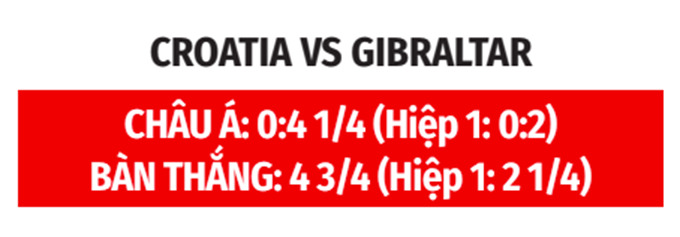 - Croatia thắng theo châu Á: Croatia thắng 3/5 trận gần nhất; thắng 5, hòa 1, thua 1 ở 7 trận sân nhà vừa qua. Còn Gibraltar không thắng 4/6 trận gần đây, thua 5/8 chuyến xa nhà gần nhất. Do đó, những người yêu mến Croatia có thể đặt niềm tin vào họ ở trận này.