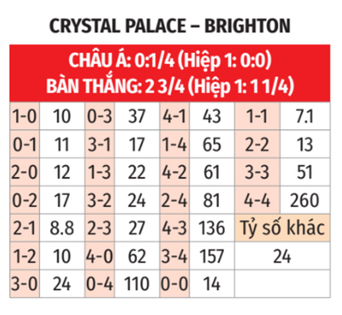 - Tối đa 9 phạt góc: 6/7 trận gần nhất giữa Crystal Palace và Brighton chỉ có tối đa 9 quả phạt góc. 3/4 trận gần đây của Crystal Palace số phạt góc còn không hơn được 7.