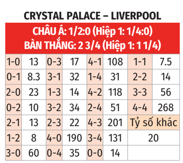 - Hiệp 1 không quá 1 bàn: 6/8 trận gần đây giữa Crystal Palace và Liverpool không có quá 1 bàn ở hiệp 1. 3/4 trận sân nhà vừa qua của Crystal Palace và 6/8 trận sân khách gần nhất của Liverpool cũng diễn ra theo kịch bản tương tự.