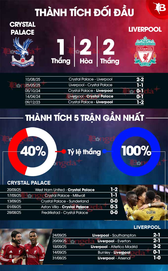 Tuy Crystal Palace cũng tỏ ra vô cùng lỳ lợm với chiến tích bất bại 9 trận gần nhất (thắng 3, hòa 6), nhưng nếu xét về phong độ thì tất nhiên họ không thể sánh được với Liverpool. Xin lưu ý, Crystal Palace đang có chuỗi 12 trận không thắng liên tiếp khi tiếp đón Liverpool. Khi không được lịch sử ủng hộ, họ nên chuẩn bị sẵn tinh thần cho khả năng sắp phải nhận trận thua đầu tiên ở Premier League 2025/26.