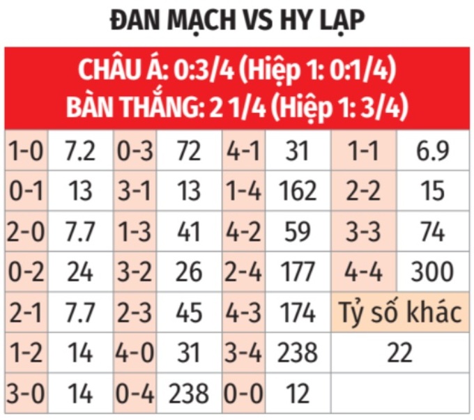 - Tối thiểu 3 bàn cả trận: 3/4 trận đấu gần đây của Đan Mạch đều xuất hiện từ 3 bàn thắng trở lên. Tình trạng tương tự xảy ra ở 6 trận vừa qua của Hy Lạp.