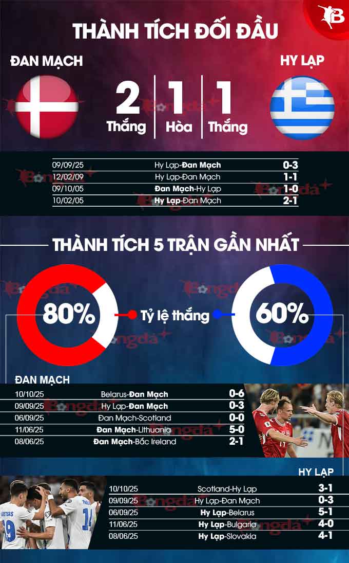 - Lẻ bàn thắng: 3/4 lần gặp giữa 2 đội gần đây kết thúc lẻ bàn thắng. Tình trạng tương tự xảy ra ở 4/5 trận sân nhà gần đây của Đan Mạch và 12/17 đấu sân khách vừa qua của Hy Lạp.