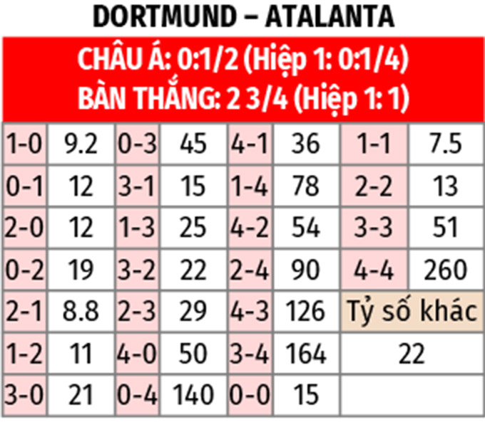 - Atalanta thắng theo châu Á: Các cầu thủ Dortmund để thua theo châu Á ở 3/4 trận gần đây khi nhường đối thủ 1/2 trái tương tự như trận này. Với Atalanta, đội khách thắng theo châu Á 3/4 trận vừa qua.