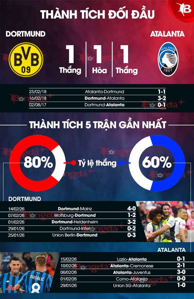 Mặc dù có đôi chút thất vọng tại đấu trường Champions League, nhưng tại Bundesliga, các cầu thủ Dortmund đang có phong độ cực kỳ ấn tượng, khi thắng 5 trận liên tiếp và thu hẹp khoảng cách với đội đầu bảng Bayern Munich xuống còn 6 điểm. Nói chung, đội chủ sân Signal Iduna Park đang có phong độ rất tốt và sẽ rất muốn kéo dài chuỗi trận thắng khi gặp Atalanta.
