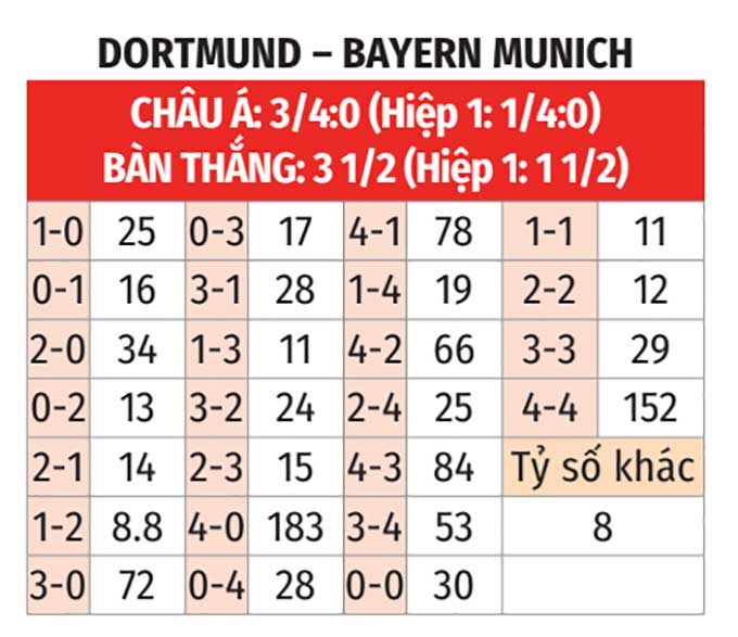 - Trên 3 bàn: 8/10 trận sân khách gần đây của Bayern đều có trên 3 bàn. 3/4 trận gần nhất của Dortmund số bàn thắng cũng chạm tới ngưỡng 4.