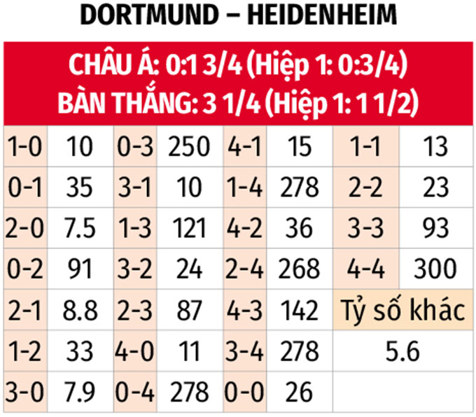 - Từ 2 đến 3 bàn thắng: 6/8 trận gần đây của Dortmund cùng 7/9 trận vừa qua của Heidenheim đều kết thúc với từ 2 đến 3 lần lưới rung. Lịch sử cũng chứng kiến 2 trận gặp nhau gần nhất có từ 2 đến 3 bàn thắng được ghi.