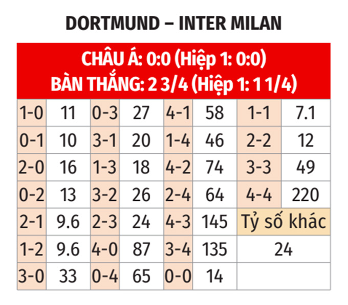 - Hiệp 1 không quá 1 bàn: 5/7 trận gần nhất của Dortmund và 5/8 trận vừa qua của Inter Milan đều có không quá 1 bàn thắng trong hiệp 1. Không những thế, kịch bản tương tự trong hiệp 1 cũng xảy ra ở 6/7 trận sân nhà gần đây của Dortmund và 5/6 chuyến làm khách vừa qua của Inter.