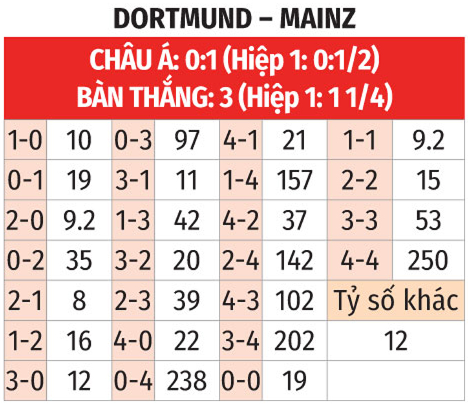 - Chẵn bàn thắng: 7/10 trận gần nhất 2 CLB đối đầu với nhau có tổng bàn thắng chia hết cho 2. Ngoài ra, 6/10 trận sân nhà vừa xong của Dortmund cũng chứng kiến điều tương tự. Chưa hết, 7 trận liên tiếp khi Dortmund tiếp Mainz trên sân nhà có tổng bàn thắng chẵn.