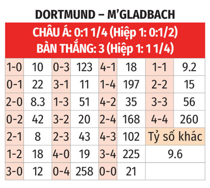- Tỷ số chẵn: 4/6 trận gần đây của M'Gladbach đều kết thúc với tỷ số chẵn. 3 trận vừa qua của Dortmund cũng có số bàn thắng chia hết được cho 2.