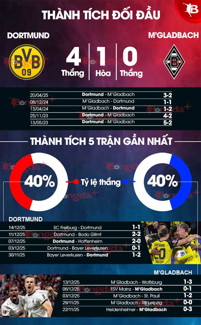 Riêng về thành tích sân khách thì họ thậm chí còn vừa liên tiếp đánh bại St. Pauli, Heidenheimer và Mainz 05. Phong độ ấn tượng là lý do để M'Gladbach có thể tự tin hướng tới ít nhất một kết quả hòa trên sân của Dortmund.