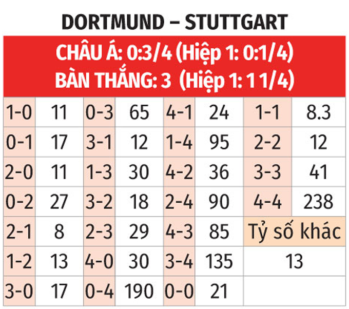 - Lẻ bàn thắng: 6/10 trận đối đầu gần nhất giữa Dortmund vs Stuttgart có tổng bàn thắng không chia hết cho 2. Ngoài ra, 3/5 trận sân nhà trận vừa xong của Dortmund và 6/10 trận sân khách vừa qua của Stuttgart đều chứng kiến điều tương tự.