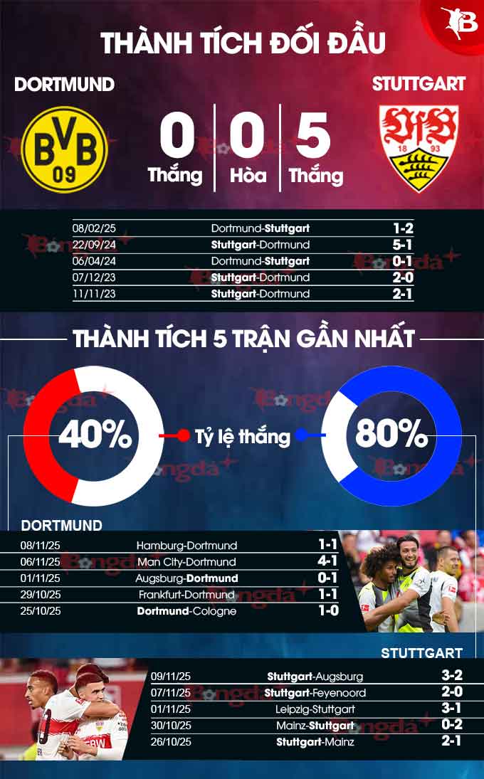 Tuy nhiên, Stuttgart lại đang lấn lướt Dortmund ở những lần gặp nhau gần đây khi bất bại với thành tích thắng 5, hòa 1. Có khả năng, Stuttgart sẽ kiếm được 3 điểm ngay trên sân của Dortmund.