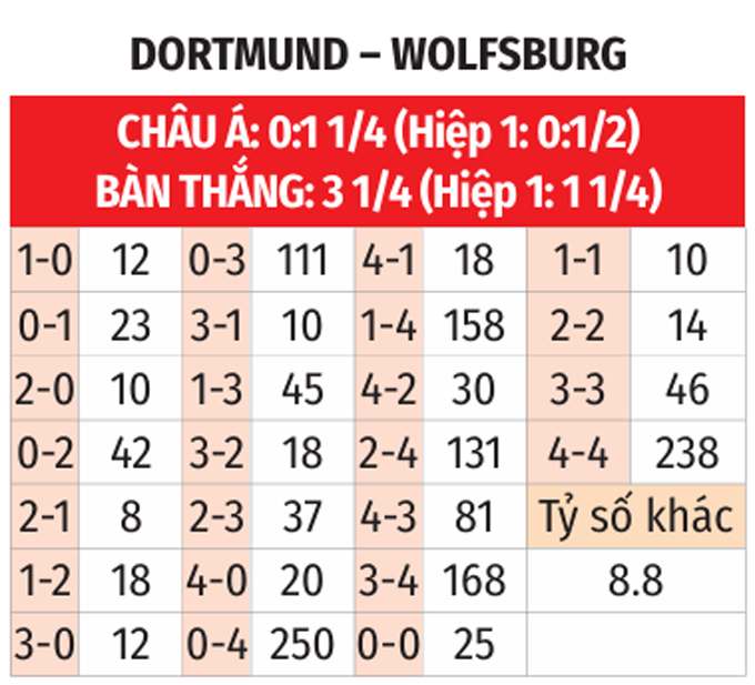 - Chẵn bàn thắng: 4 trận đối đầu gần nhất giữa 2 CLB có tổng bàn thắng chia hết cho 2. Ngoài ra, 3/4 trận vừa qua của Dortmund và Wolfsburg đều chứng kiến điều tương tự.