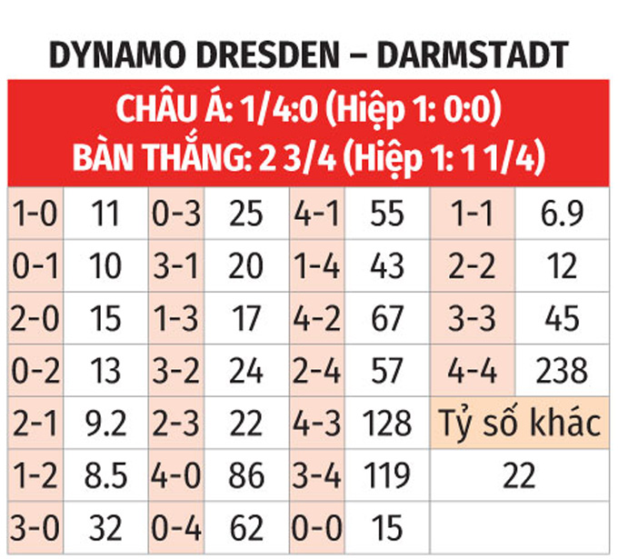 - Lẻ bàn thắng: 4/6 lần so T trước đây giữa đôi bên đều có tổng bàn thắng không chia hết cho 2. Ngoài ra, 6/10 trận vừa xong của Dynamo Dresden cũng chứng kiến điều tương tự. Chưa hết, 5/7 trận gần nhất khi Dynamo Dresden tiếp Darmstadt trên sân nhà cũng có tổng bàn thắng là số lẻ.