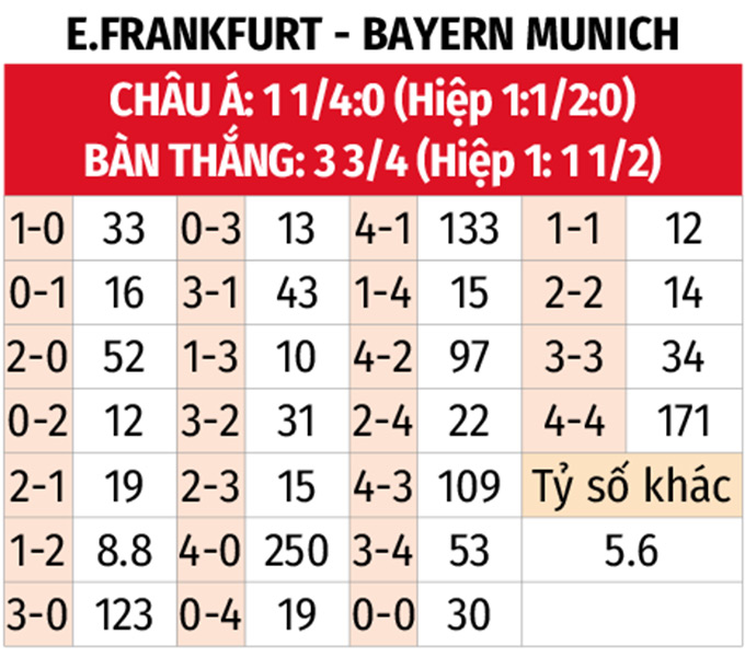- Ít nhất 2 bàn hiệp 1: 9/10 trận đã đấu của Eintracht Frankfurt đều có tối thiểu 2 bàn thắng trong hiệp 1. Bên phần sân đối diện, 5/6 trận vừa qua của Bayern Munich cùng 3/4 trận đối đầu gần nhất cũng xuất hiện tối thiểu 2 bàn trước giờ nghỉ.
