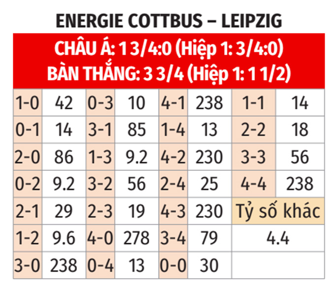 - Hiệp 1 từ 2 bàn trở lên: 6/8 trận gần nhất của Energie Cottbus và 4/6 trận gần đây của Leipzig đều khép lại hiệp 1 với tối thiểu 2 bàn. Ngoài ra, 9/12 trận sân nhà vừa qua của Energie Cottbus và 5/8 trận làm khách gần đây của Leipzig đều có ít nhất 2 lần lưới rung hiệp 1.