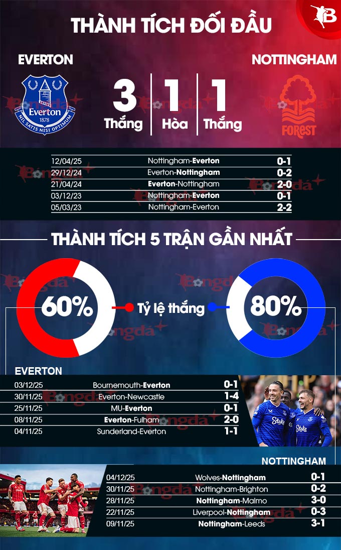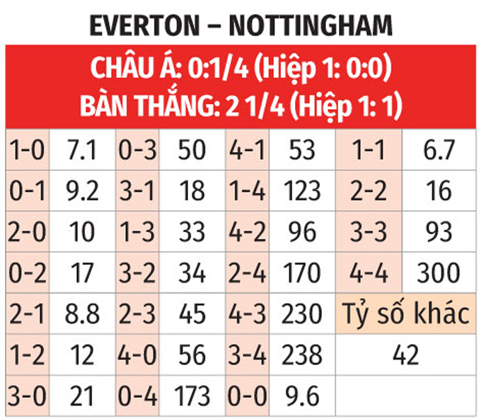 - Lưới rung 15 phút cuối: 4/6 trận gần đây so T giữa 2 CLB có bàn thắng từ phút 75 trở đi. Chưa hết, 3/4 trận sân nhà mới đây của Everton và 3/5 trận vừa xong của Nottingham chung kịch bản.