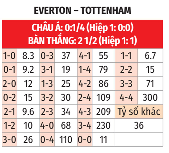 - Tối thiểu 3 bàn: 3/4 trận gần đây của Tottenham đều có tối thiểu 3 bàn. Cả 4 trận đối đầu gần nhất giữa đại diện thành London và Everton số lần lưới rung cũng không dưới 3.